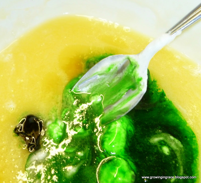 Remove from microwave oven and add 1 teaspoon of vanilla and 1 teaspoon of green food coloring, mix well..